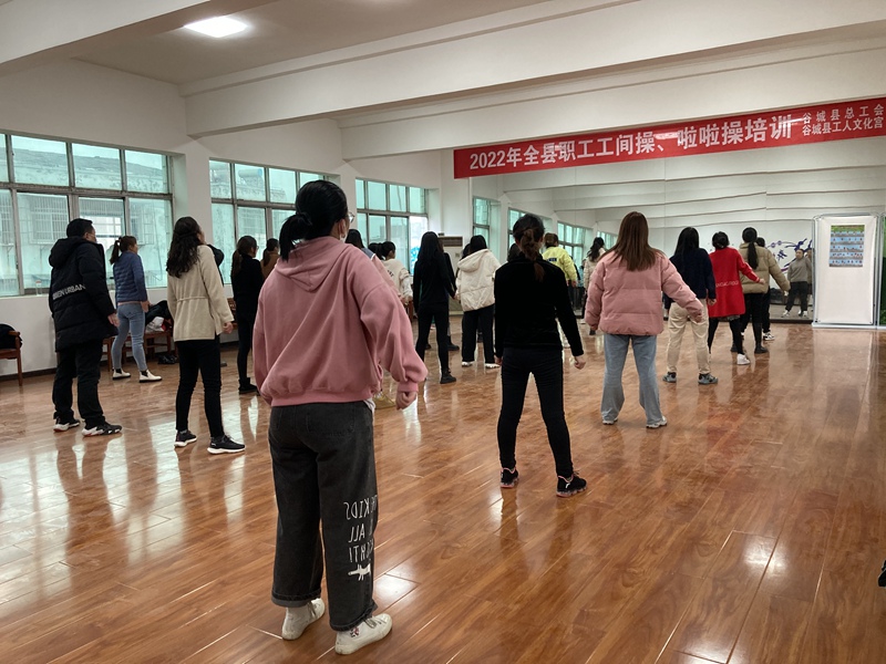 为全力推进谷城“五县建设”,打造健康名县,倡导文明健康生活方式,推进工间操全覆盖、常态化开展,谷城县2022年全县职工工间操、啦啦操培训班在县总工会五楼职工活动室火热进行中。