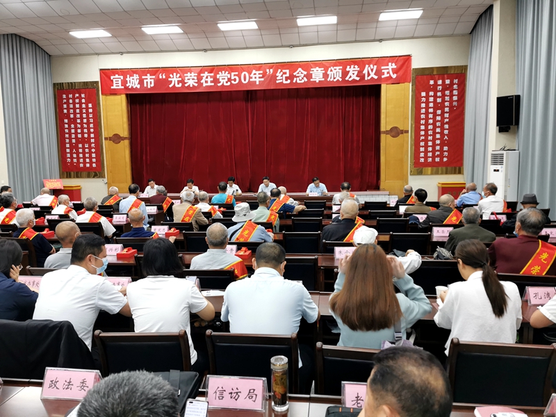 (通讯员:贾玉芬)6月17日上午,宜城市委组织部在宜城市财培中心隆重举行“光荣在党50年”纪念章颁发仪式。中共宜城市总工会离退休干部支部贾文英、郑士贵2名老党员参加仪式并获得纪念章。