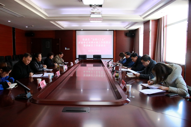 (通讯员:柳朝霞)12月20日,县法院与县总工会召开“法院+工会”劳动争议诉调对接工作联席会暨调解员工作座谈会,县法院党组书记、院长张永海,县总工会党组书记、常务副主席张继平参加会议。