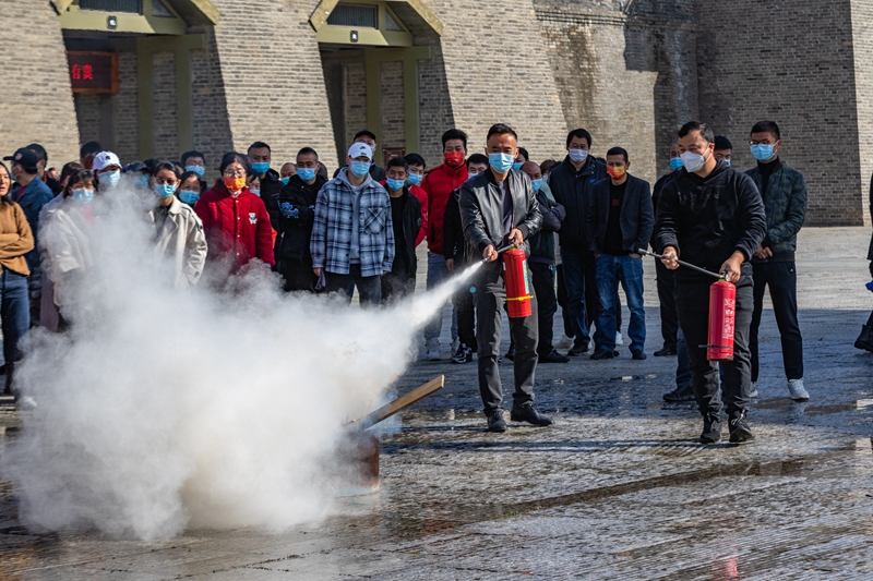 演练现场,听到报警声后,所有人员开始疏散、逃生、自救演练。随后,消防教员在景区明德门广场讲解有效逃生的重要法则、初期火灾的扑救、消防器材的使用等知识,并引导所有人员进行灭火实战操作。