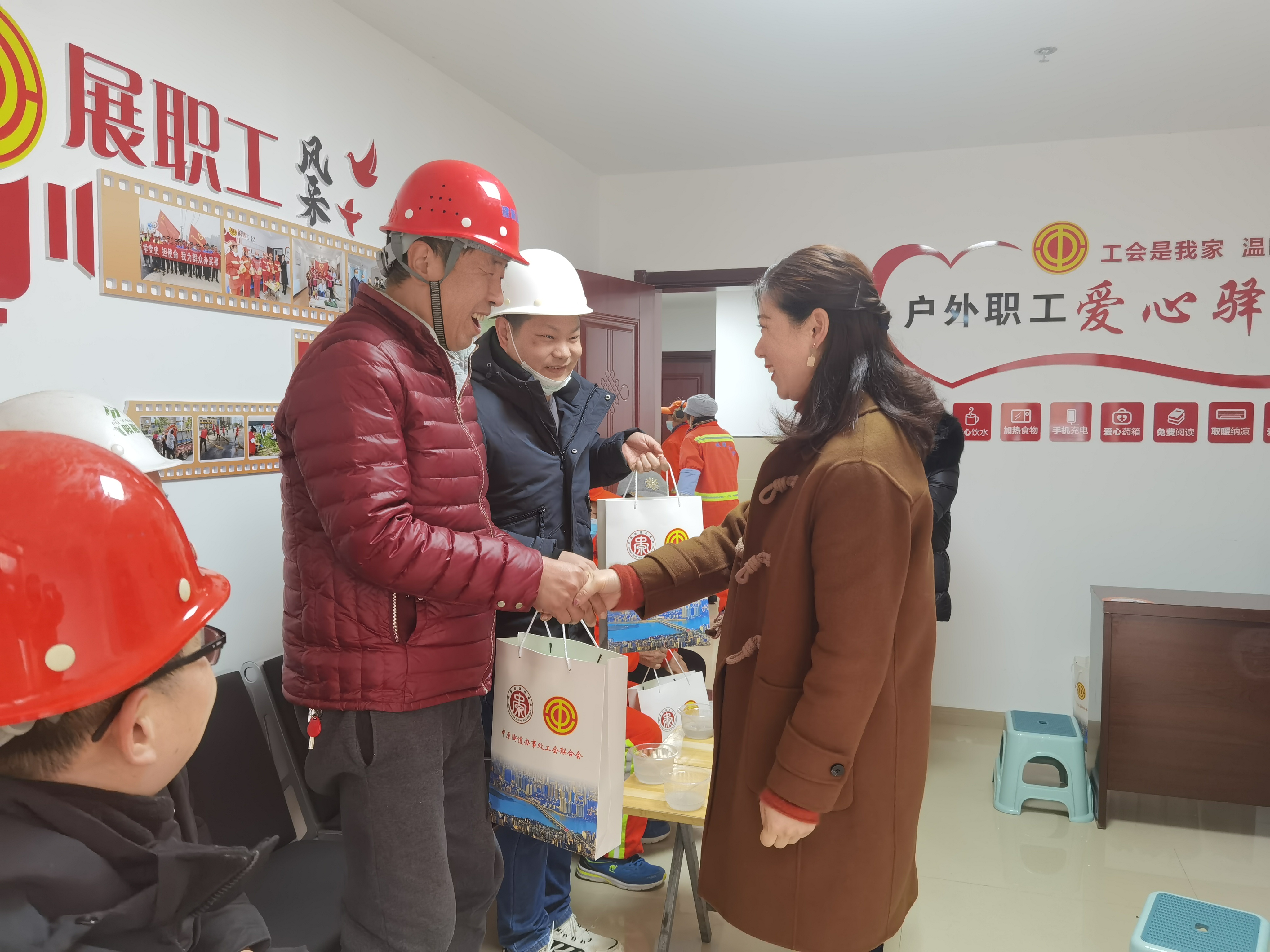 在洪家沟社区户外职工爱心驿站为辖区环卫工人、建筑工人等户外工作者送健康送温暖,把“特别的祝福送给特别的他们”。
