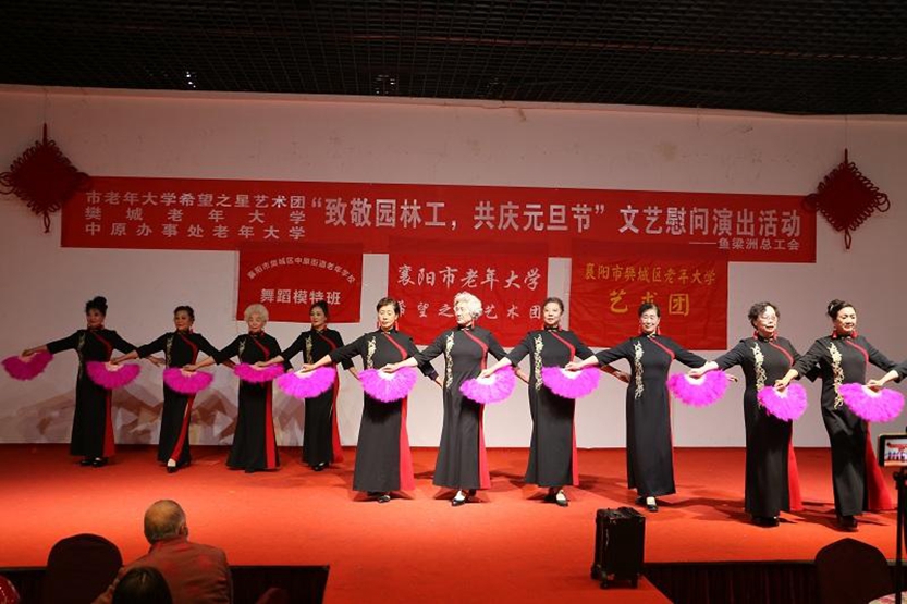 歌舞、情景剧、模特秀、乐器合奏……现场节目形式多样,气氛热烈,来自市老年大学希望之星艺术团、樊城区老年大学、中原办事处老年大学90余名师生通过精彩的表演,对城市绿心鱼梁洲的园林工人们进行了慰问。