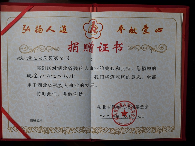 湖北雪飞化工有限公司是一家非公企业,多年来,在公司工会的宣传和推动下,一直坚持履行企业的社会责任,无论企业遇到什么困难,公司始终把助残、困难群众帮扶和慈善捐赠纳入公司发展规划,做到一同布置、一同推进。先后帮扶困难群众80多人,向社会慈善事业捐赠达600多万元,安置和帮扶残疾人16人。
