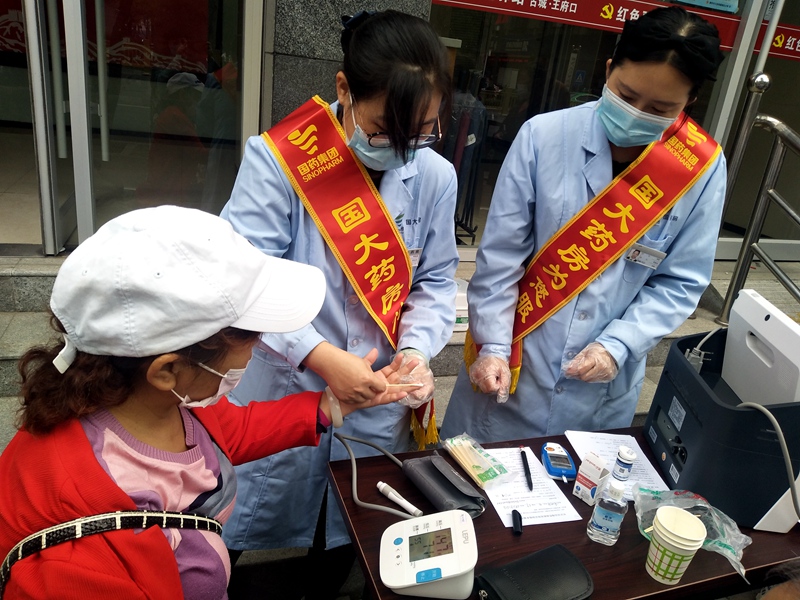 活动中,国大药房公司人员详细询问了居民的身体状况,免费为社区居民测血压、血糖、血脂、心电图监测,引导居民填写慢性病调查问卷,提供慢性病办理咨询服务及常见慢性病如高血压、糖尿病等的健康指导,并为慢性病居民提供专业的用药意见,告知居民一些常见疾病的防治知识,指导居民合理膳食、规范用药、科学锻炼。