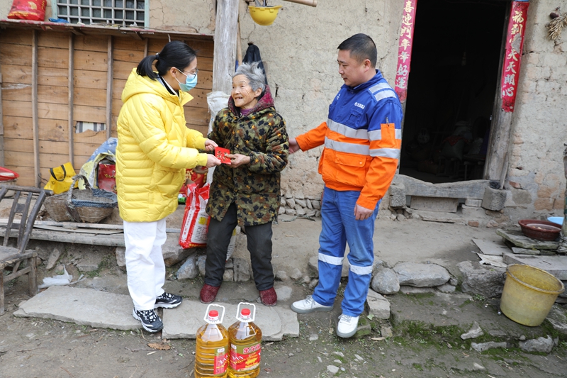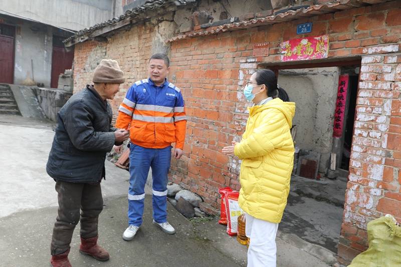 在慰问活动中,公司工会副主席吴佳、公共关系经理郑超与工会委员们组成“送温暖”小组,在村书记的陪同下,不顾天气寒冷,分别深入南背村三组和四组,木瓜园二组、黄垭村一组等贫困户家中,为他们送上慰问金、东北大米、金龙鱼食用油等物资。