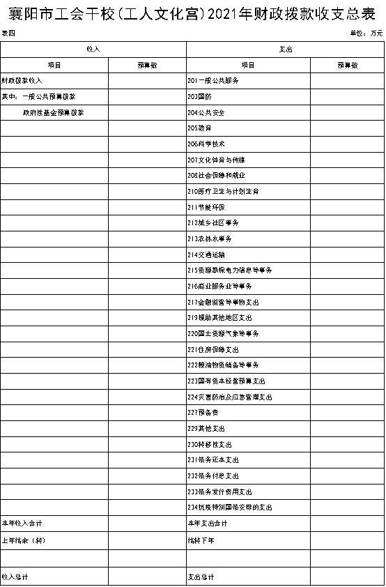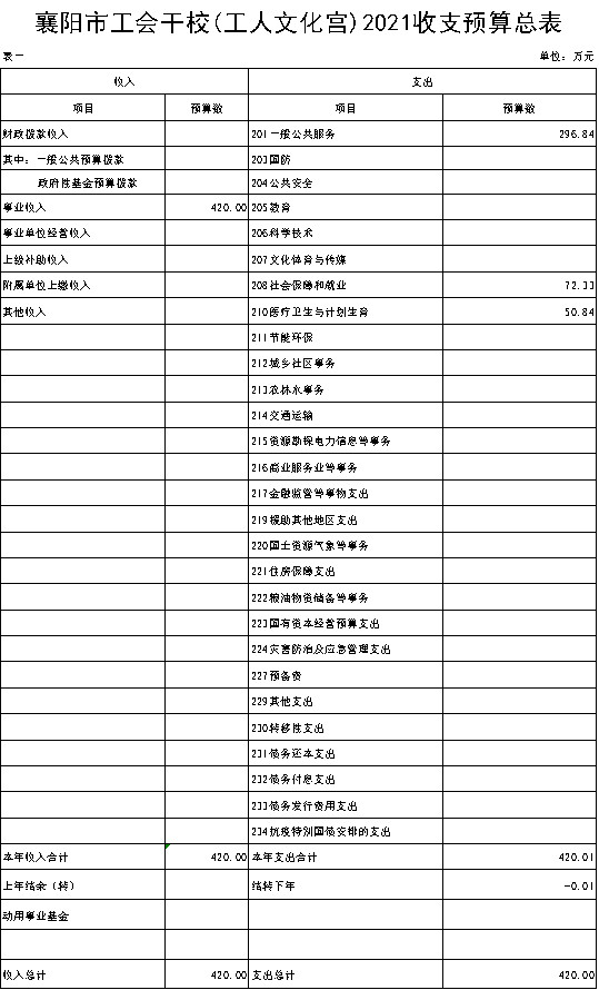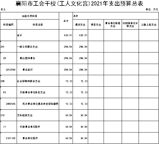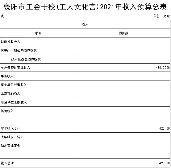 目 录 第一部分 襄阳市工会干部79991cm德彩网概况 第二部分 2021年襄阳市工会干部学校预算情况说明 第三部分 2021年襄阳市工会干部学校预算公开表 第四部分 名词解释 第一部分 襄阳市工会干部79991cm德彩网概况 一、主要职责 襄阳市工会干部学校隶属市直机关79991cm德彩网,事业公益二类预算单位。成立于上世纪50年代中期,现主校区位于国家4A景区古隆中核心区。校园按多功能格局星级标准设计建设,集会议、培训接待、成人教育、休闲养生、特色饮食于一体。有180座多媒体报告厅1个,90座多功能培训教室1个,40座多媒体会议室2个,标准教室10间,学员宿舍18间;普通客房73间,商务套房6间;100座学员餐厅及球场、室内乒乓球、阅览室等文体设施。 主要职责:负责工会干部培训、职业技能培训、成人学历教育、承接各单位培训,提供200人以下中小型会议全套优质服务。 二、79991cm德彩网概况情况 襄阳市工会干部学校设7个职能部室,分别为:办公室、培训处、学生处、招生处、教务处、成教处、总务处。 三、部门预算单位构成 2021年我单位市级部门预算单位--襄阳市工会干部学校。 第二部分 2021年襄阳市工会干部学校预算情况说明 一、2021年部门预算收支情况说明 (一)预算收入情况 2021年襄阳市工会干部学校部门预算总收入420万元:其中非税收入(学费收入)为2019级在校学员230人,预计学费收入57.5万元。2020级在校学员350人,预计2年学费收入175万元,2021级新生预计招收750人,预计学费收入187.5元。比上年增加预算收入300万元,主要预计扩大招生规模。 (二)预算支出情况 2021年市工会干部学校部门预算总支出420万元,其中:在职48名人员预计开支基本工资173.2万元,93年工改保留补贴2.9万元,交通补贴12.7万元,在职物业补贴11.6万元,事业单位津贴96.5万元,养老保险72.3万元,职工基本医疗保险50.8万元。 (三)预算收支增减变化情况 本单位预算收支增减无变化情况。因上年未报部门预算无对比数据。 二、2021年财政拨款收支情况 (一)财政拨款收入预算 2021年本单位无财政拨款收入。 (二)财政拨款支出预算 2021年本单位无财政拨款项目支出。 三、2021年一般公共预算支出情况 本单位无2021年一般公共预算支出。 四、2021年一般公共预算基本支出情况 本单位无2021年一般公共预算支出。 五、2021年政府性基金预算支出情况 本单位无政府性基金预算。 六、2021年“三公”经费预算情况 2021年学费收入未列2021年“三公”经费预算。 七、2021年国有资本经营预算拨款收支情况 本单位无国有资本经营预算。 八、其他相关情况说明 1、机关运行经费情况 2021年市工会干部学校本级事业运行费在一般公共预算中安排420万元(非税收入-学费收入负担),明细如下:事业运行费296.84万元,其中基本工资173.2万元,93年工改保留补贴2.9万元,交通补贴12.7万元,在职物业补贴11.6万元,事业单位津贴96.5万元,机关事业单位基本养老保险缴费72.3万元,事业单位职工基本医疗保险50.8万元。 2、政府采购预算情况 本单位2021年无政府采购预算。 3、国有资产占用情况 根据《中华人民共和国工会法》的有关规定,工会资产由工会组织独立核算、独立管理,因此本单位无国有资产占用情况。 4、政府债务情况 本单位无政府债务情况。 5、预算绩效情况 第三部分 2021年襄阳市工会干部学校预算公开表