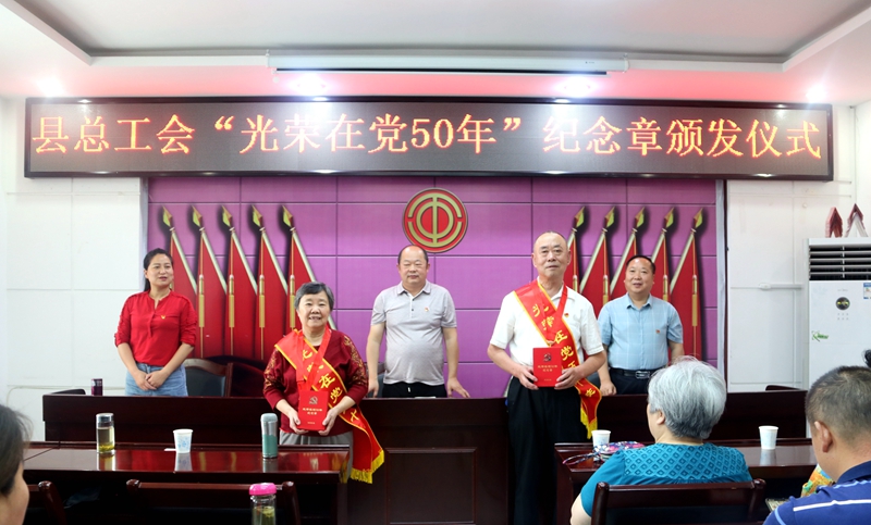(通讯员:全克成 王川 王丽娟)6月25日上午,南漳县总工会举行“光荣在党50年”纪念章颁发仪式,将“光荣在党50年”纪念章发放到工会老党员手中,让他们切切实实感受到党组织的关怀和温暖。